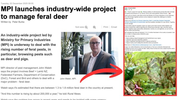 MPI announced a new deer and pig programme, and Forest and Bird shares support online.