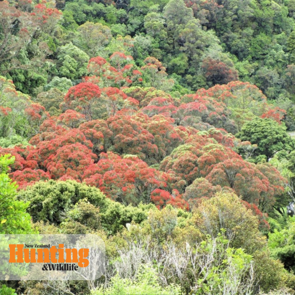 Southern Rata in the gorge flowering during January 2021. Apparently, it has been shown that one possum feeding on a Rata or Pohutukawa continuously can kill the tree in a couple of years.