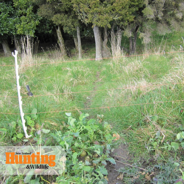 A well-defined track coming out of the native gorge for possums to dine on our swedes. I shot and plucked 15 possums one night close to this track in the swede crop.