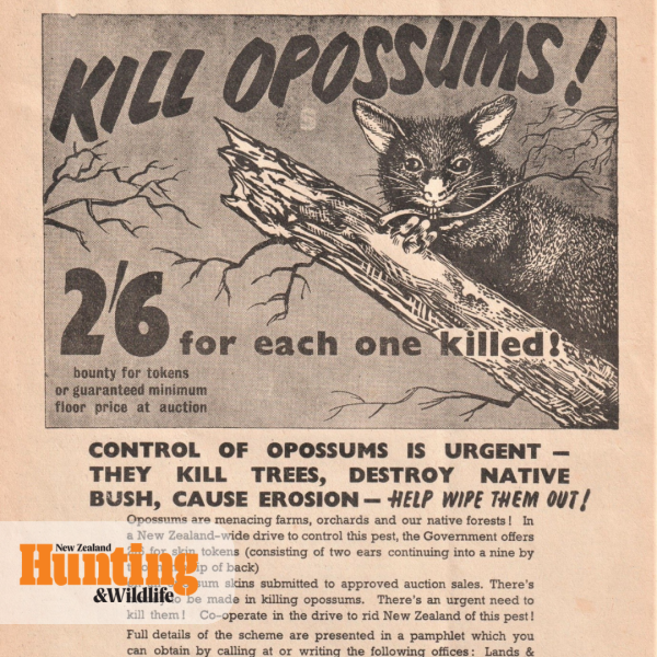 The Department of Internal Affairs was not satisfied that unregulated possum hunting would control numbers. Therefore, the department embarked on a nationwide programme of field research to survey the effect possums were having on our forests. This showed that more positive action was required, so a bounty of 2s/6d was paid for each possum killed on the presentation of a token. This token was the ears attached to a strip of skin down the back which meant that the person killing possums could not both claim the half-crown and sell the skinned pelt – it was either one or the other. In 1956, possum control was passed to the New Zealand Forest Service. In 1960, the bounty was removed.