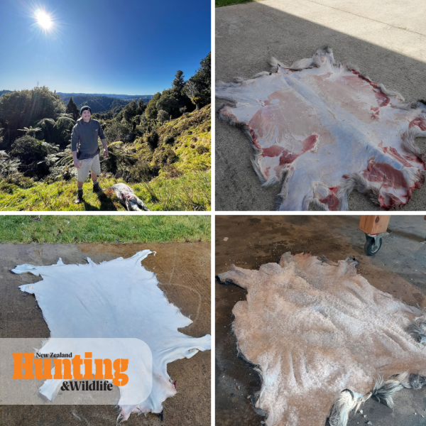 Step 4: Heavily salt the flesh side of the skin, covering all of the raw hide (I use pool salt from Mitre 10 or non-iodised salt from the supermarket). Once salted, fold the skin in half, roll it up and place it in a sack or bag that liquid can drain out of. Hang the bagged skin for a day to draw moisture out of the skin. (The skin can remain salted for some time if needed).
