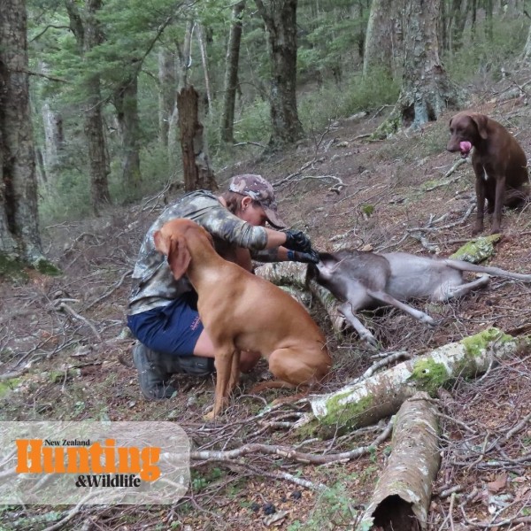 Greg must have not been far away because all of a sudden Scout was running past me to the doe. She got a fierce call and retreated back to Greg’s side. Maia however was beside me with the widest grin. She may not love the rifle going off at the range, but loves being out in the bush when it does. She must know that spoils come with this type of shot. Although I must say she is pretty fussy on what she will and won’t accept on the hill, unlike the forever hungry GSP. Anyways, it turned out Greg had appeared onto the clearing just as I took the shot. We proceeded to head over and check her out. This is the first fallow that I have seen to have such an intense glossy black coat. It even had spots within the black. She was magnificent. We took photos and I thanked her for her sacrifice to feed our family. I then I set to work gutting and making her into a backpack for the walk out to the ute. I was very thankful that fallow are a small deer as we not only had to go back down the hill to the creek which was still quite soft under foot but also navigate back through that matagouri and bush lawyer we came through earlier, this time each of us with a deer on our backs. There was also the short but steep hill back to the ute that once climbed would signal another successful day on the hill for us, it would not only top up our freezer, but our family would also enjoy the spoils of this trip for a while and tide us over…until the next adventure.