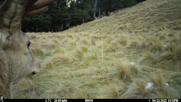 Photo Credit: DOC Static Camera Survey Project – South Island High Country Station (marker pegs are used for distance scale) – T Moore, DOC, 2025